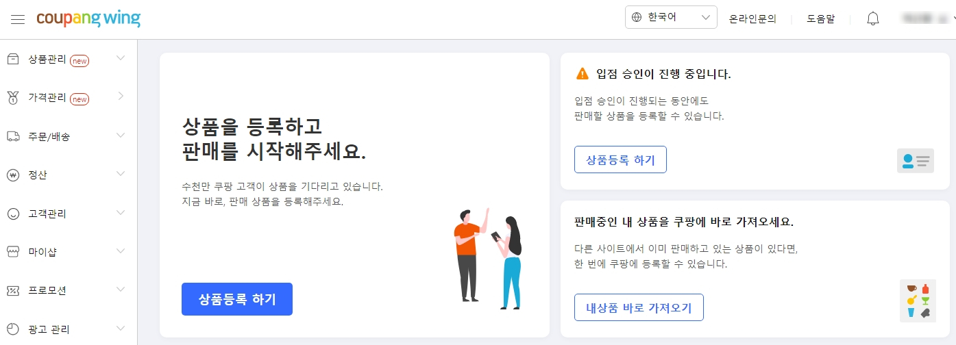 7. 입점 승인이 진행 중으로 변경되며 상품을 등록하면 됩니다.