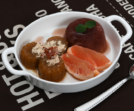 6. 자몽을 껍질을 제거 후 갈아서 젤리를 만들고, 접시에 굳혀놓은 홍시와 아이스 수정과를 담는다 |