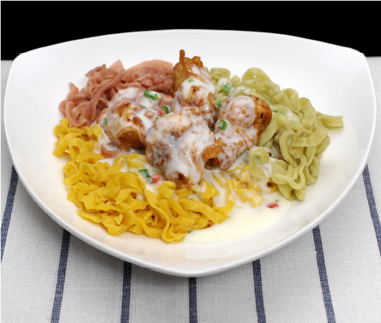 6. 파스타면(④) 위에 튀긴 닭(⑤)을 올리고 냄비에 크림소스를 끓이다가 설탕을 넣고, 다시 끓으면 파프리카와 피망, 깻잎(③)을 넣고, 한 번 더 끓인 후 깐풍파스타에 올려 완성한다. |