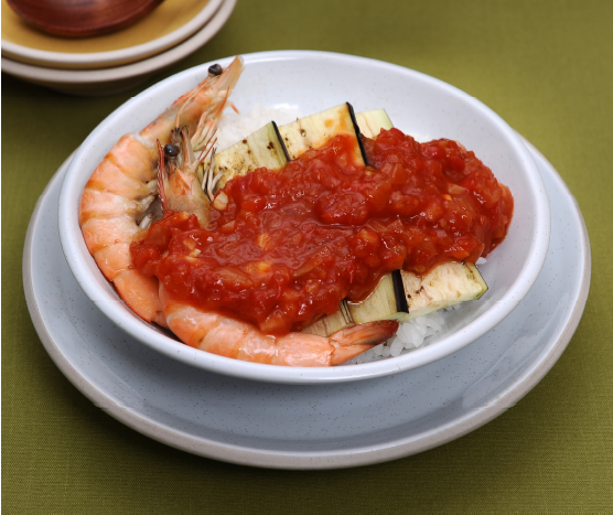 6. 볶아지는 양파와 마늘에 토마토소스와 케첩을 넣어 볶다가 토마토와 설탕을 넣어 볶다가 졸이고, 밥을 그릇에 담고, 구운 가지와 새우를 올린 후 졸여 놓은 토마토소스를 위에 올린 후 어린잎을 살짝 올려 완성한다. |