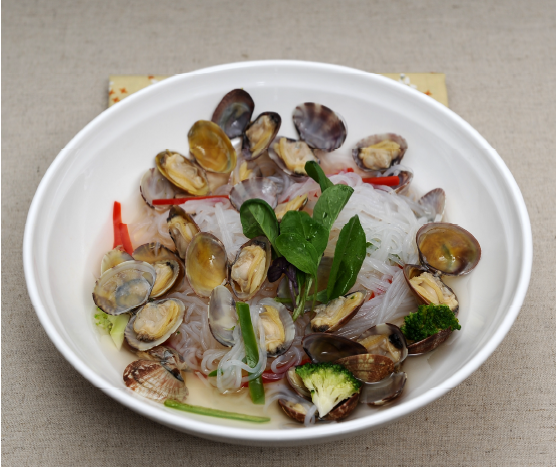 바지락(100g), 브로컬리(20g), 소금(2g), 마늘(10g) 파프리카(20g), 청양고추(10g), 올리브오일(5g) 실곤약(100g), 후춧가루(0.1g) - 곁들임채소 : 어린싹(10g)