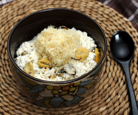 두부(100g), 소금(0.2g), 홍합(50g), 버터(5g), 황태(100g) 육수(100g), 생크림(20g) 달걀(10g), 참기름(5g), 통깨(5g)