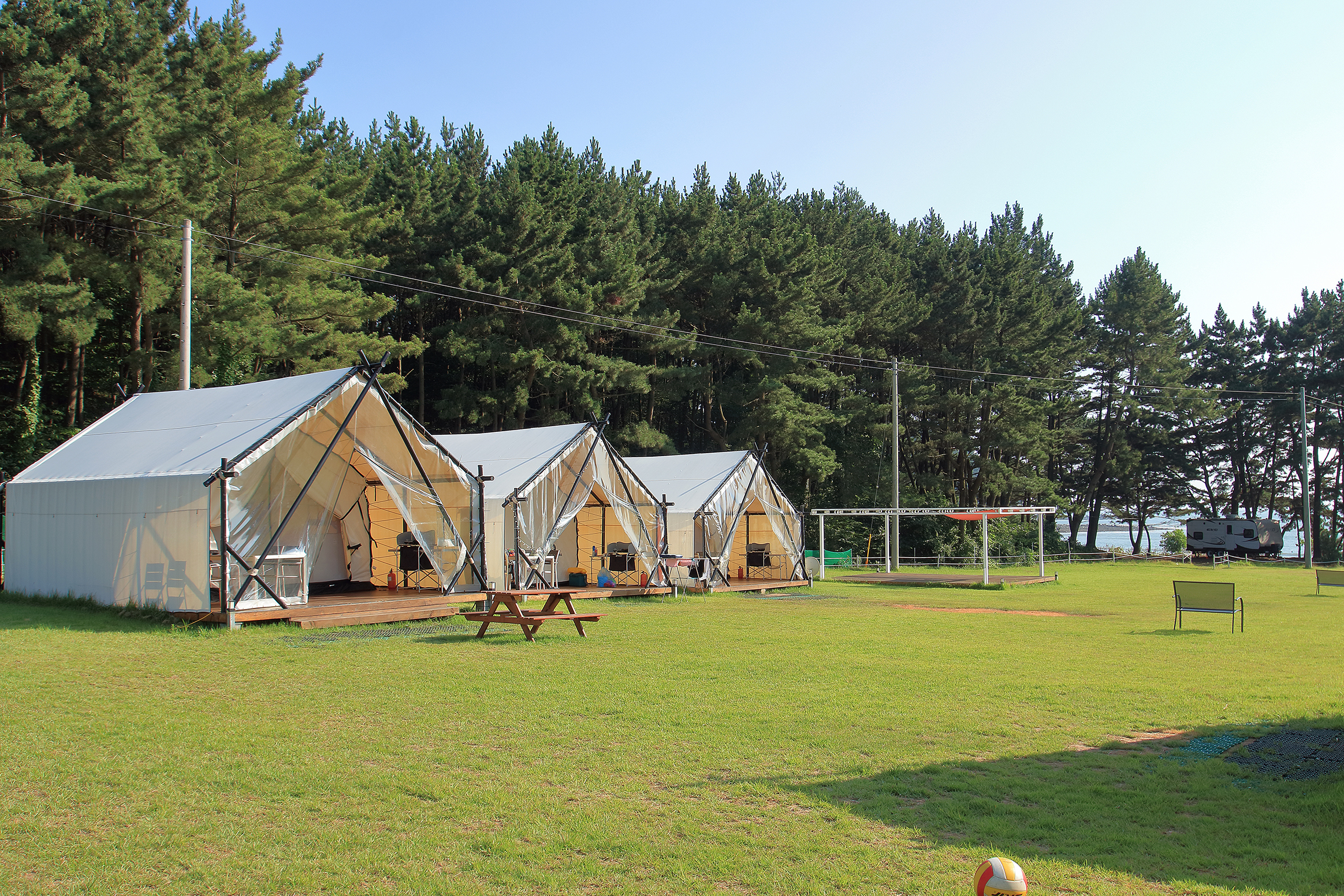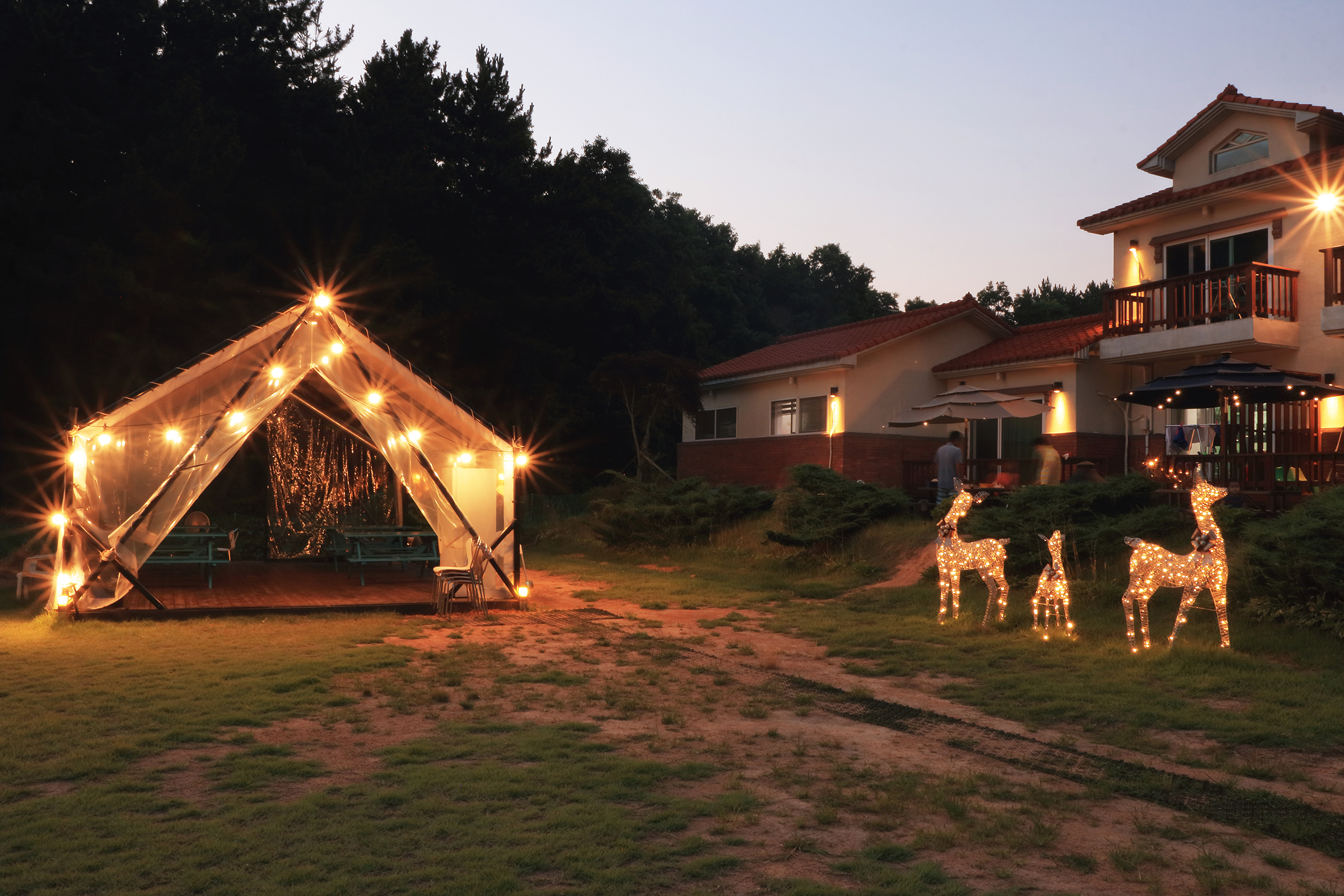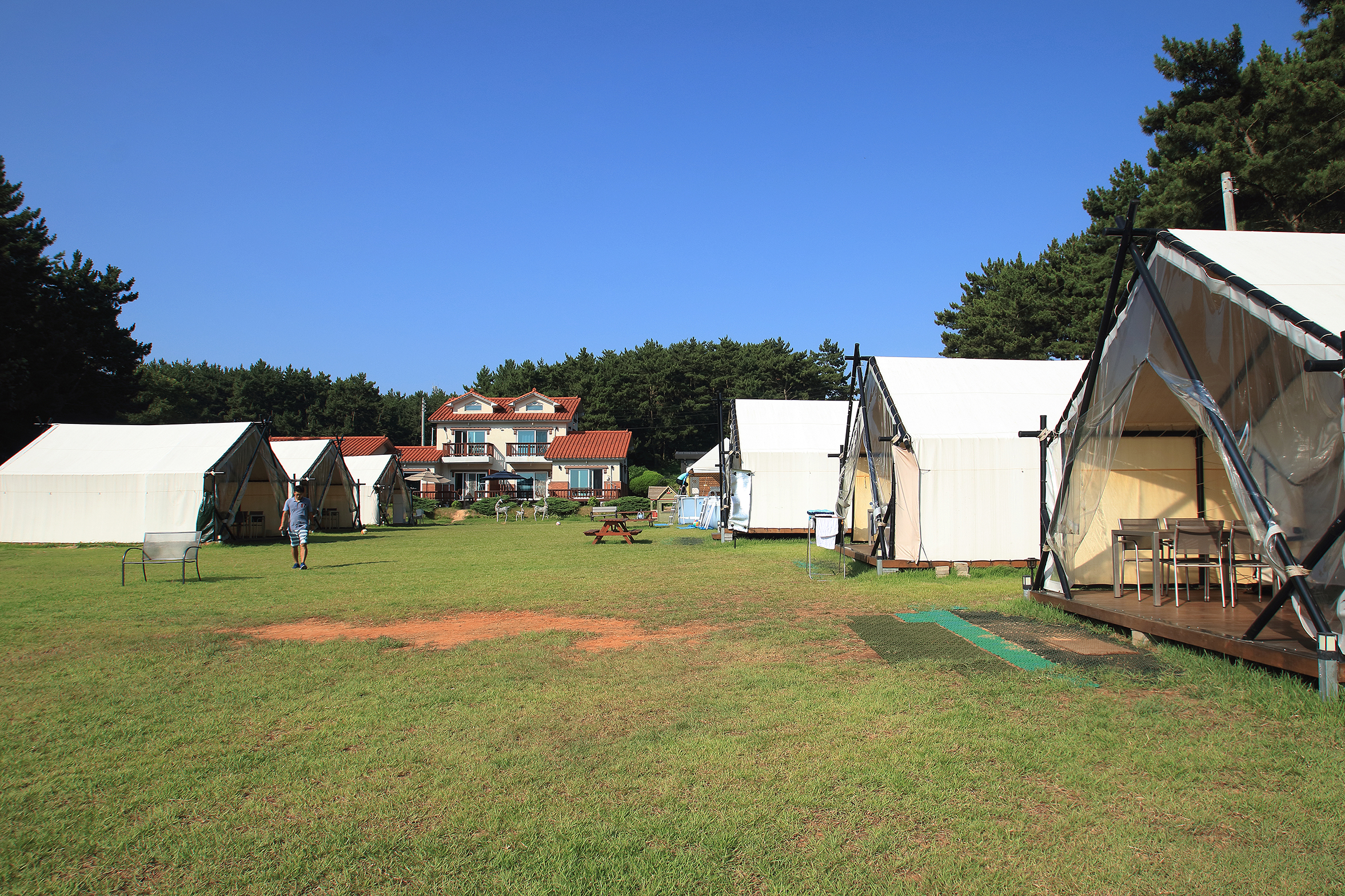 드넓은 잔디밭에서 여유롭게 즐기는 글램핑