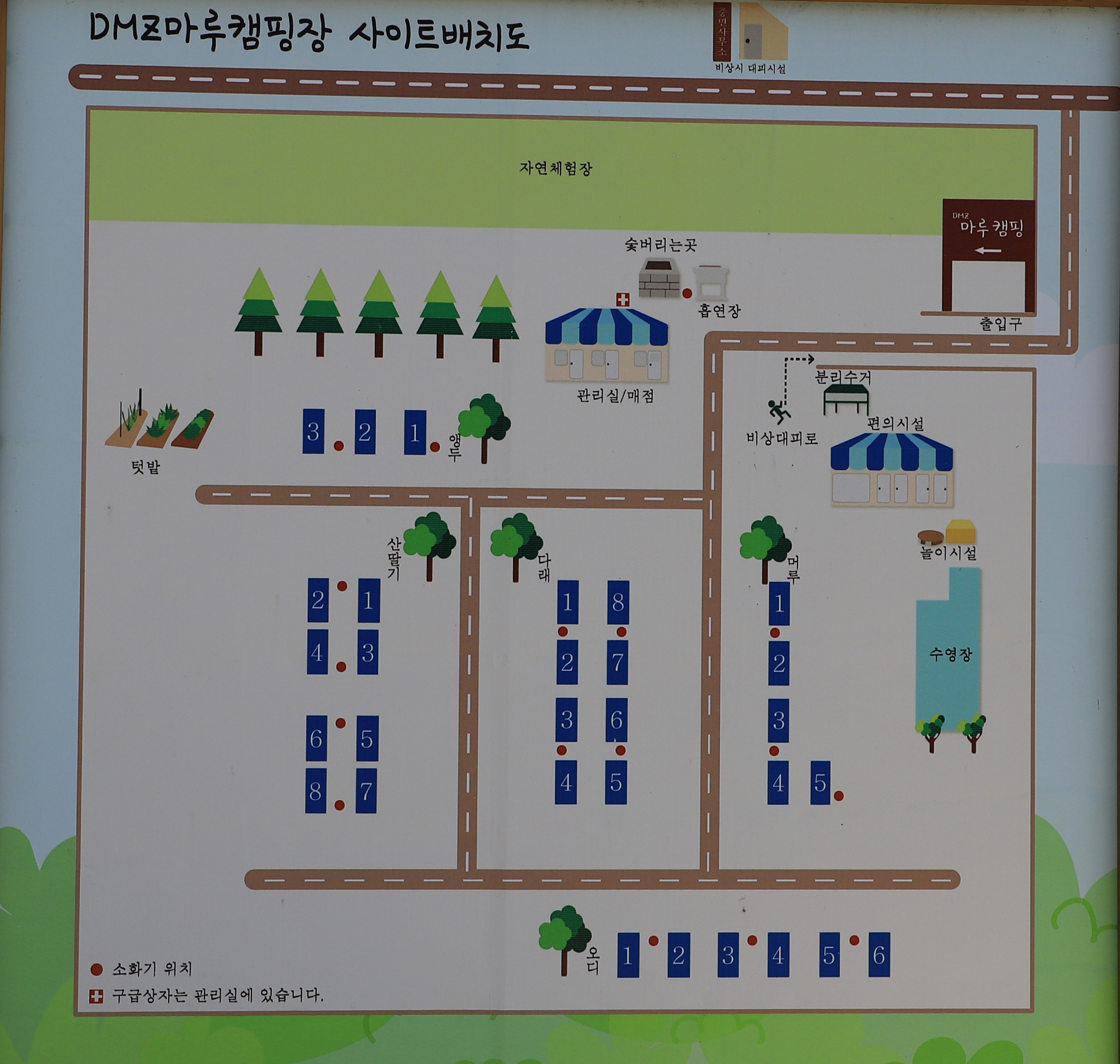 - 부대시설 : 전기,무선인터넷,장작판매,온수,트렘폴린,물놀이장,놀이터,운동시설