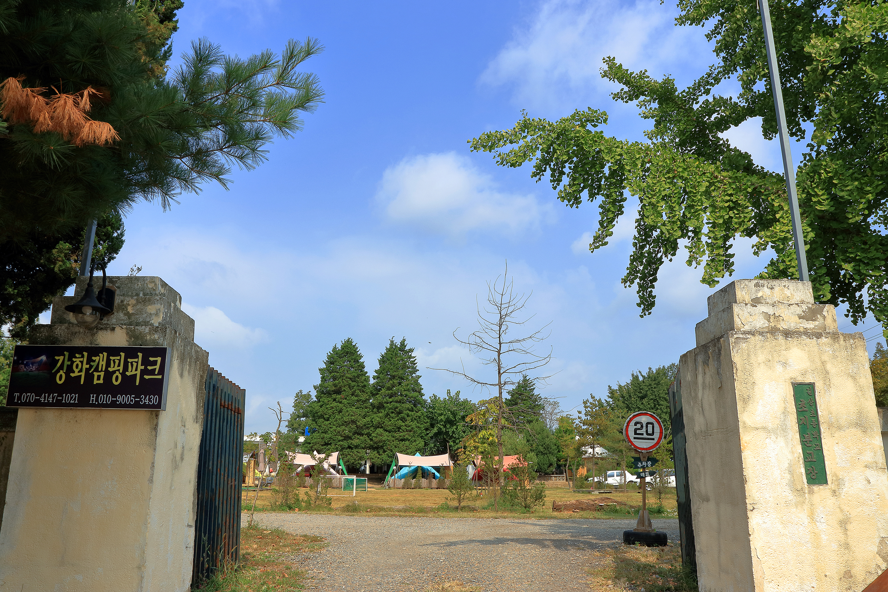 강화캠핑파크는 인천광역시 강화군 길상면에 자리했다. 강화초지대교를 넘어 약 5분만 달리면 도착한다. 신촌교차로에서 오른쪽으로 가면 되는데, 캠핑장 입구까지 가는 길이 좁은 편이니 운전에 주의해야 한다. 이곳은 폐교를 리모델링해 캠핑장을 조성했다. 이 때문에 곳곳을 돌아다니다 보면 동상, 교실 등 추억을 자극하는 볼거리가 많다. 널찍한 운동장에는 오토캠핑 30면, 글램핑 15면이 있다. 모든 사이트에서 전기와 화로 사용이 가능하다. 글램핑 객실은 취사도구를 비롯해 식기류, 테이블, 의자 등 캠핑용품을 갖췄다. 교실로 쓰이던 건물로 들어가면 장작, 숯, 식품, 음료 등을 판매하는 매점이 있다. 교실 건물 뒤로 개수대, 화장실, 샤워장 등이 위치했다.