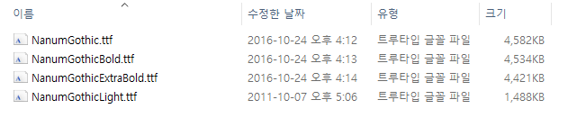 예를 들어 나눔고딕 폴더를 들어가보면 위와 같이 OTF / TTF 라는 압축파일이 보이실거에요.